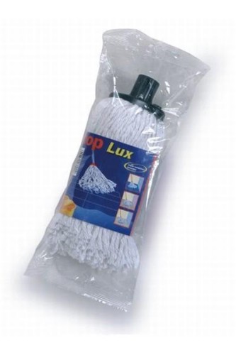Bawełniana, sznurkowa końcówka mopa. Dobrze wchłania wodę i łatwo się wyciska. Mop zakończony plastikowym gwintowanym uchwytem do wkręcania kija o standardowej średnicy. Doskonale sprawdza się jako domowy lub biurowy mop do standardowego wycierania podłóg.